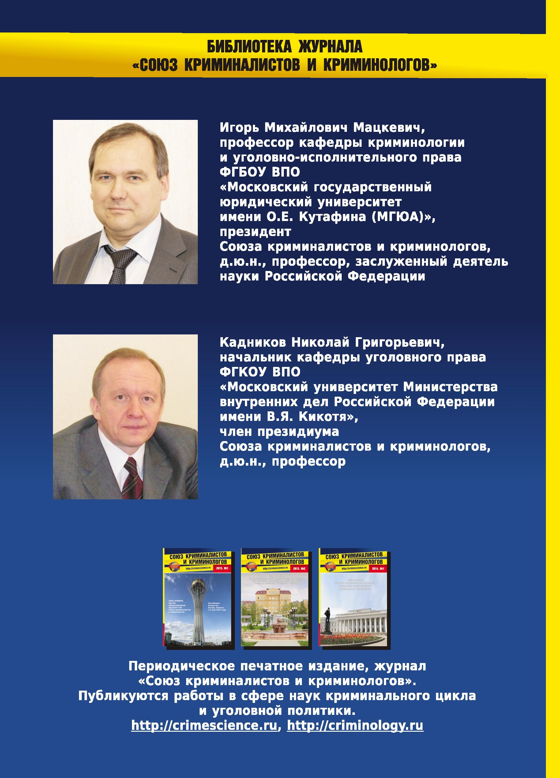 Рецензенты: Юрий Алексеевич Красиков, доктор юридических наук, профессор (ФГБОУ ВПО «Московский государственный технический университет им. Н. Э. Баумана», кафедра «Юриспруденция, интеллектуальная собственность и судебная экспертиза», профессор), Геннадий Юрьевич Лесников, доктор юридических наук, профессор (ФГКУ «Всероссийский научно-исследовательский институт Министерства внутренних дел Российской Федерации», научно-исследовательский центр № 1 «Исследование криминологических проблем, прогнозирование преступности, изучение общественного мнения», главный научный сотрудник).
