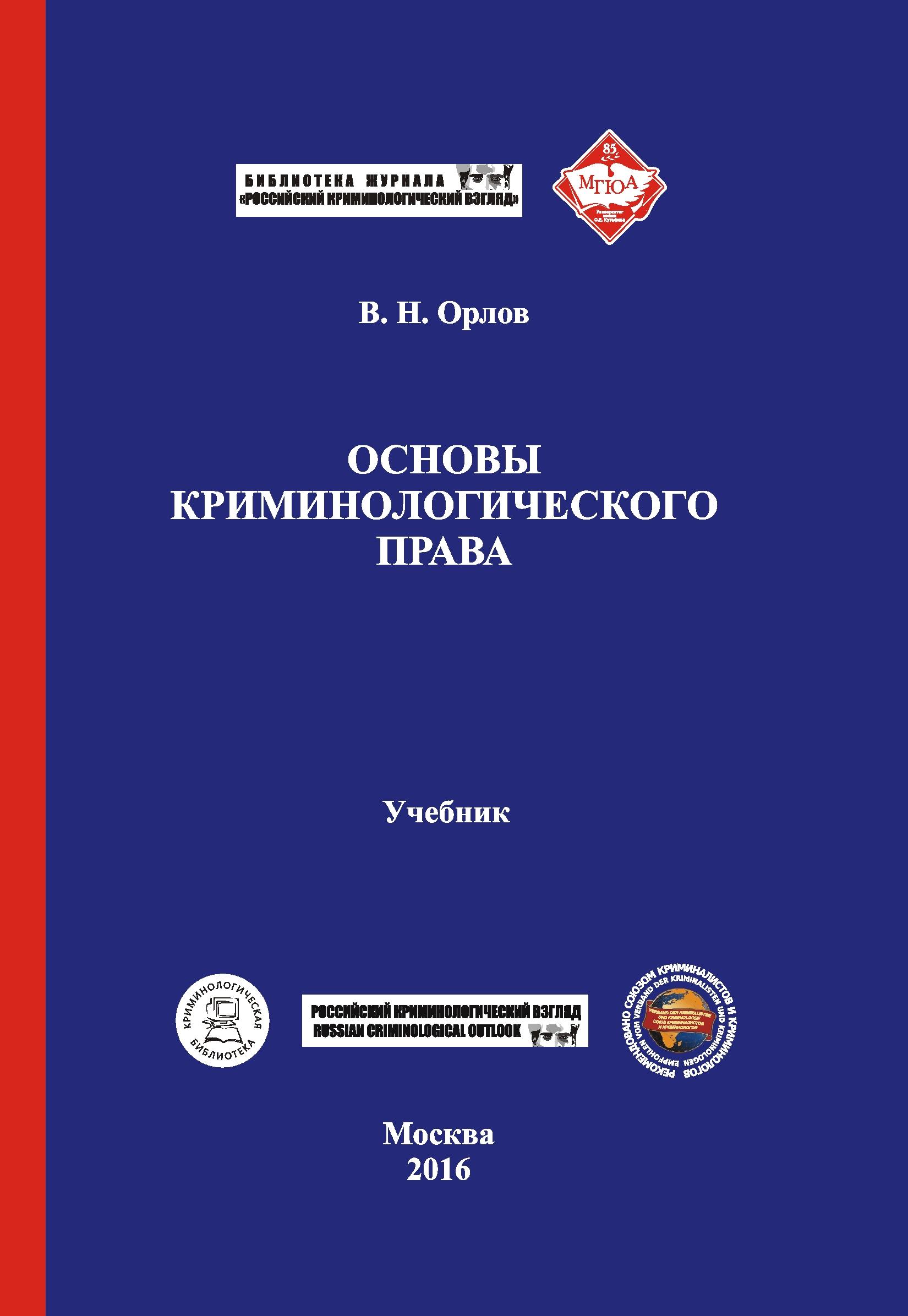 Опубликован первый учебник по криминологическому праву:Орлов, В. Н. Основы криминологического права: учебник / В. Н. Орлов; Моск. гос. юрид. ун-т им. О. Е. Кутафина (МГЮА); журнал «Российский криминологический взгляд». – М.: Криминологическая библиотека; Ставрополь: АГРУС Ставропольского гос. аграрного ун-та, 2016. – 668 с. – (Библиотека журнала «Российский криминологический взгляд») - http://criminology.ru/library/tutorials/7758.html