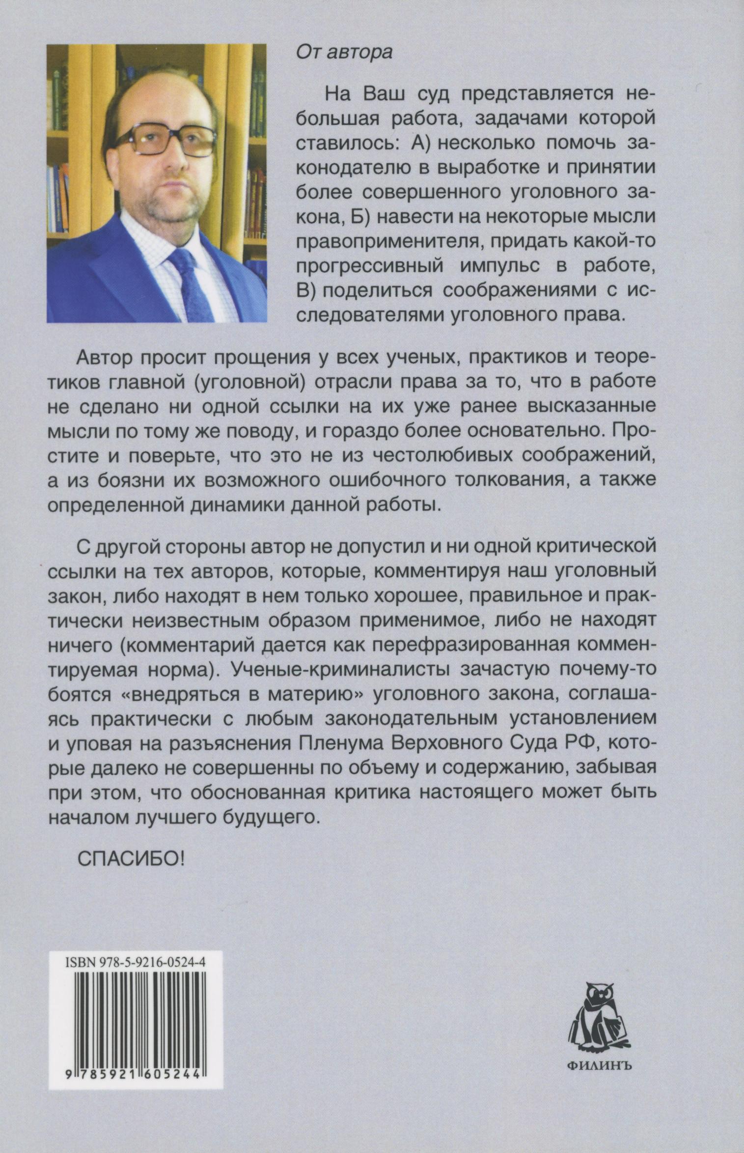 В аннотации к изданию отмечается, что комментарий к нормам Общей части Уголовного кодекса Российской Федерации построен на краткой обоснованной и конструктивной критике действующего уголовного законодательства. Автор является не только ученым, но и практикующим адвокатом по уголовным делам, что позволяет ощущать истинную современную правоприменительную практику, которая должна учитываться в проблематике уголовного законодательства. Задачей данной работы явилось выявление несовершенных: несправедливых, непоследовательных, формальных, противоречивых и не совсем корректных положений норм Общей части УК РФ. Для исследователей уголовного права, законодателя и правоприменителя, интересующихся проблемами уголовного закона.