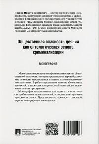 В аннотации к изданию отмечается, что монография посвящена метафизическим аспектам общественной опасности, которые представлены через абсолютные ценности, нуждающиеся в охране уголовно-правовыми средствами. В работе предложено понятие абсолютных ценностей, a также дан алгоритм, необходимый для признания деяния преступным.