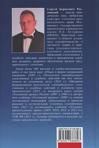Автор: Сергей Борисович Россинский – доктор юридических наук, профессор кафедры уголовно-процессуального права Московского государственного юридического университета имени О. Е. Кутафина (МГЮА). Известный специалист в области уголовного судопроизводства, в частности теории и практики уголовно-процессуального доказывания, проведения следственных и судебных действий, назначения и производства судебных экспертиз, кадрового обеспечения органов предварительного следствия. Автор более 100 научных и учебно-методических работ, в том числе книг «Обыск в форме специальной операции» (2003 г.), «Результаты «невербальных» следственных и судебных действий как вид доказательств по уголовному делу» (2015 г.), «Механизм формирования результатов «невербальных» следственных и судебных действий в уголовном судопроизводстве» (2015 г.), авторского курса лекций «Уголовный процесс России» (2007 и 2008 гг.), авторского учебника «Уголовный процесс» (2009 г.), соавтор коллективной монографии «Доказывание и принятие решений в состязательном уголовном судопроизводстве» (2017 г.), коллективного учебника «Уголовно-процессуальное право» (2009, 2010, 2011 и 2013 гг.), коллективного научно-практического комментария к УПК РФ (2015 г.). Активно публикуется в ведущих научных юридических журналах.